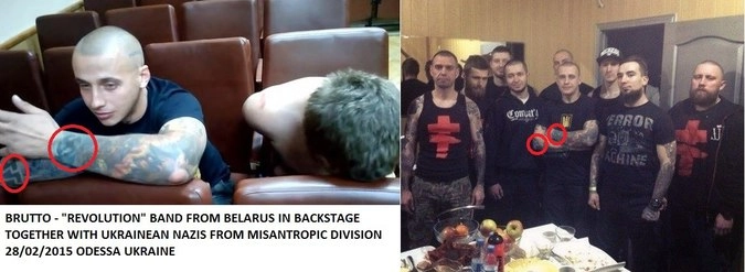 Справа от Михалка — человек в толстовке Combat14 — ультраправой боевой организации партии «Свобода», известной своим противодействием присутствии в составе самообороны майдана «черной сотни», состоящей из «анархистов», «антифа» и «левых», а именно эти люди являются основными посетителями концертов Михалка.