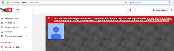 "Этот аккаунт заблокирован в связи с многочисленными или серьезными нарушениями правил YouTube (обман, распространение спама, недопустимое содержание в видео) или других положений Условий использования."