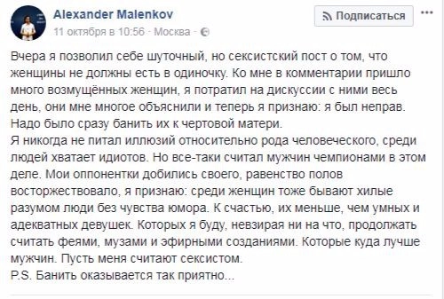 Язвительным комментариям не было конца, в результате чего Маленкову пришлось выступить в свою защиту. Он опубликовал объяснительный пост, в котором признал, что предыдущая запись была хоть и шуточной, но сексистской. При этом он не удержался от ответной колкости, заявив, что среди женщин «тоже бывают хилые разумом люди без чувства юмора», которых ему пришлось забанить. «К счастью, их меньше, чем умных и адекватных девушек. Которых я буду, невзирая ни на что, продолжать считать феями, музами и эфирными созданиями», — заключил Маленков.