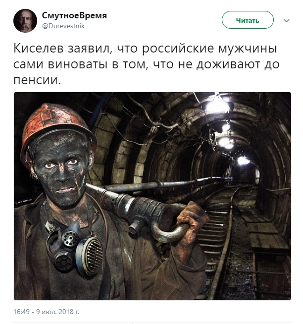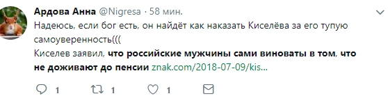 Телеведущий Дмитрий Киселев вызвал негативную реакцию Сети своим высказыванием о причинах ранней смертности россиян. Он заявил, что мужчины не доживают до выхода на пенсию из-за вредных привычек. Поэтому, по его мнению, пенсионная реформа не может негативно сказаться на продолжительности жизни мужчин в России.