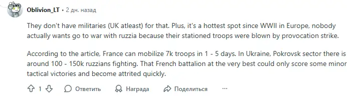 «У европейцев не хватит военной силы (у Британии точно). Плюс это самая горячая точка Европы со Второй Мировой, никто не захочет схлестнуться с русскими из-за провокаций. Франция может мобилизовать 7 тысяч за 1-5 дней. Под Покровском 100-150 тысяч русских. Этот французский батальон в лучшем случае отрапортует о „тактических успехах“ и сотрётся в порошок