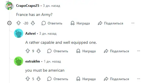 „У Франции есть армия? — Да, боеспособная и хорошо вооружённая. Ты что, американец?“