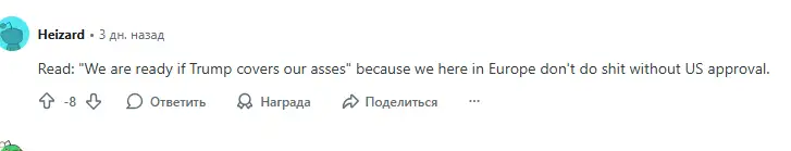 «Читай „Мы готовы, если Трамп прикроет наши задницы“. Потому что здесь, в Европе, мы по-большому сходить не смеем без одобрения США».