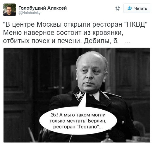 Ресторан под названием «НКВД» в центре Москвы сильно возмутил некоторых жителей столицы. Первым на новое заведение внимание общественности обратил адвокат Марк Фейгин, в свое время представляющий интересы украинской наводчицы Надежды Савченко.