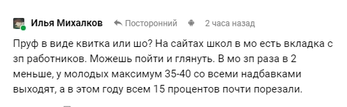 Сеть возмутили данные о среднем размере зарплаты учителя в Москве, которая якобы превышает 115 000 рублей в месяц. Некоторое время назад они были озвучены главой столичного департамента образования Исааком Калиной. Он отчитался о том, что зарплата учителей в Москве в среднем составляет 115—117 тысяч рублей. По его словам, она в три раза превышает денежное содержание педагогов в любом другом регионе Центрального федерального округа.