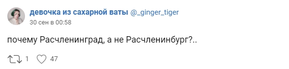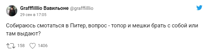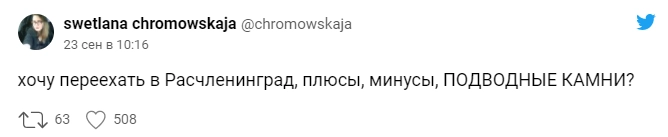 Все эти невеселые события дали старт новому стилю шуток — про то, как опасно жить в северной столице и стоит ли брать на улицу топор и мусорные мешки. Теперь город называют Расчленинград или Расчленинбург. Юмор, который зайдет далеко не всем.
