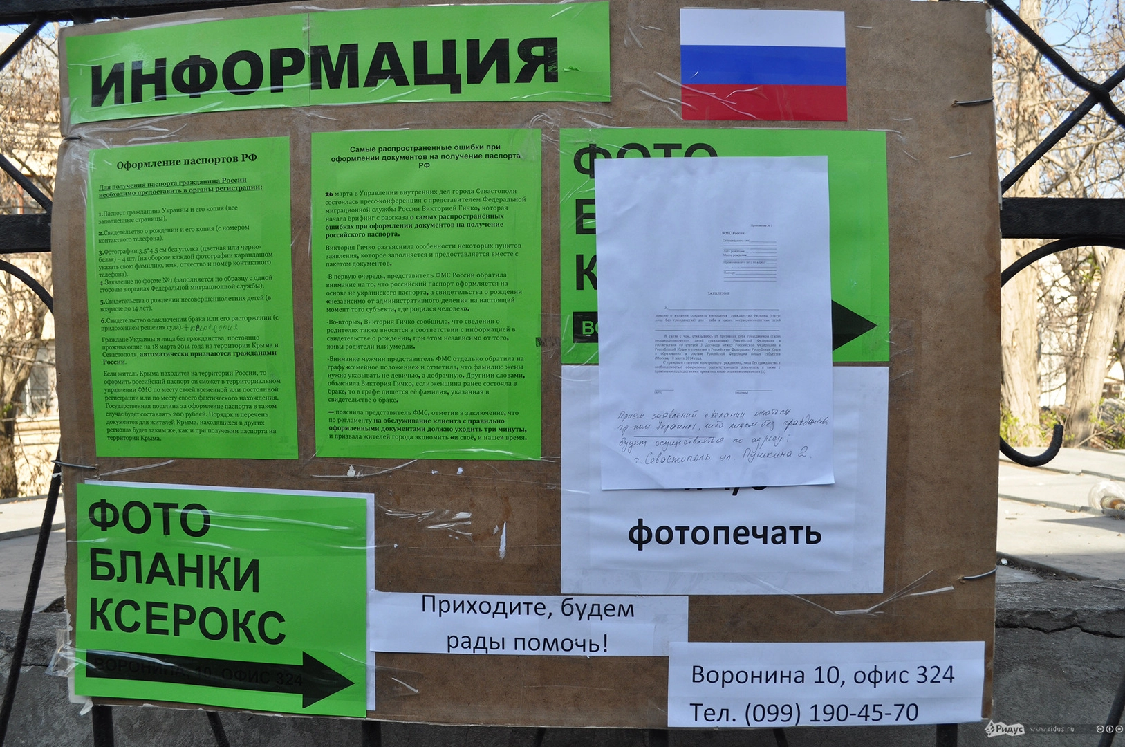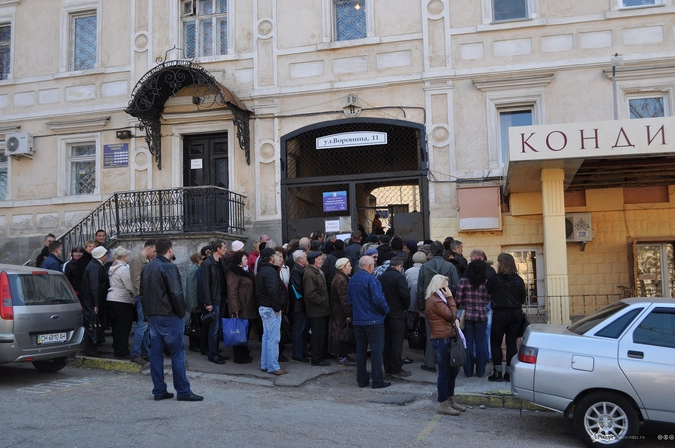 16 марта в Крыму прошел референдум, 21 марта Владимир Путин подписал закон о ратификации договора, предусматривающего присоединение Крыма и Севастополя к России. Уже 24-го марта - официальное начало оборота рубля в Крыму, а 30 марта крымчане перешли на московское время. Фактически весь процесс присоединения Крыма к России произошел за какой-то месяц. И за этот период настроения севастопольцев сменилось от паники, которую прятали за воинственностью на митинге 23 февраля, до ликования, которое явно ощущалось в городе в день подписания Крыма к России. Поэтому, когда объявили о том, что крымчанам будут выдавать российские паспорта в ускоренном порядке и без пошлины, во всех паспортных столах сформировались огромные очереди.