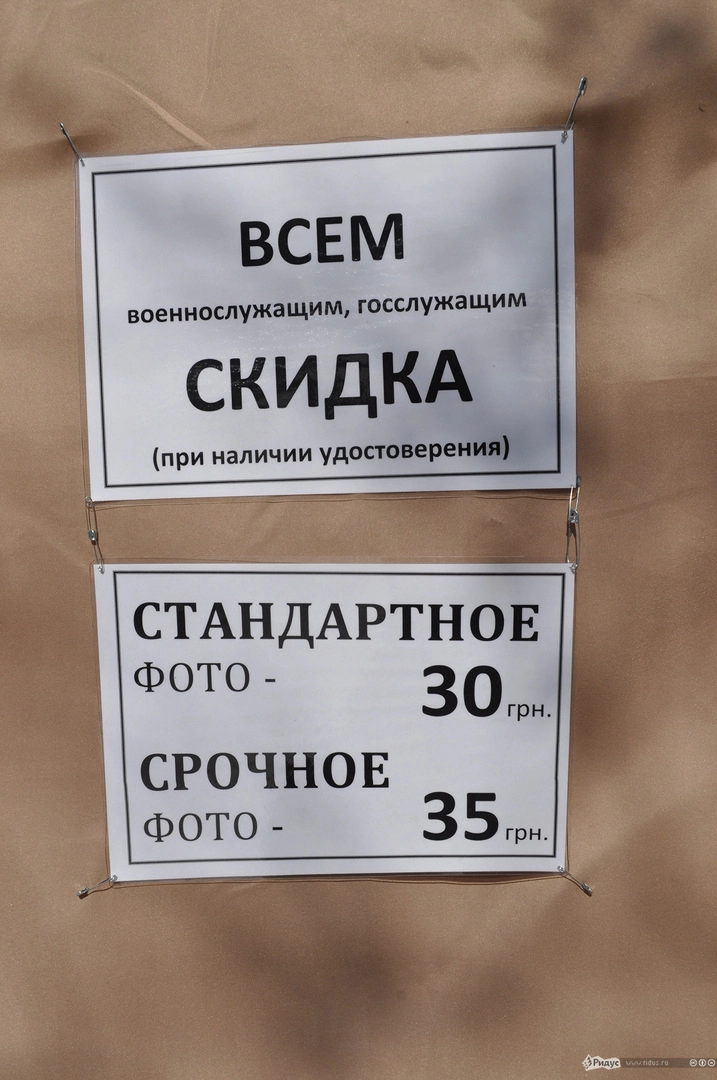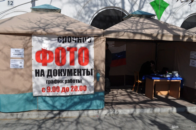 Быстро сориентировались местные фотоцентры. В некоторых резко взлетели цены на фото 35 x 45 мм. Другие наооборот, стали делать скидки. На одной из центральных площадей города даже появилась палатка с Русским флагом и скидкой для военных: