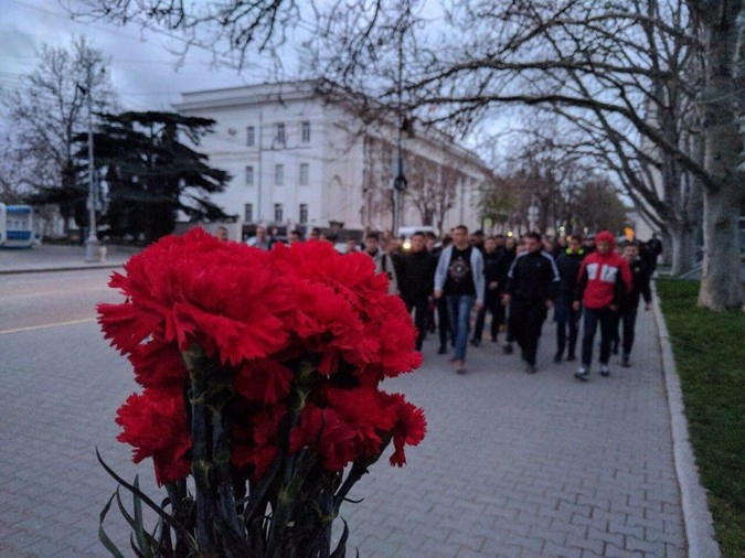 Севастопольские футбольные фанаты прошли траурным шествием до аллеи Славы, где возложили цветы к памятнику городу-герою Ленинград, а также почтили память всех жертв теракта в петербургском метро минутой молчания.