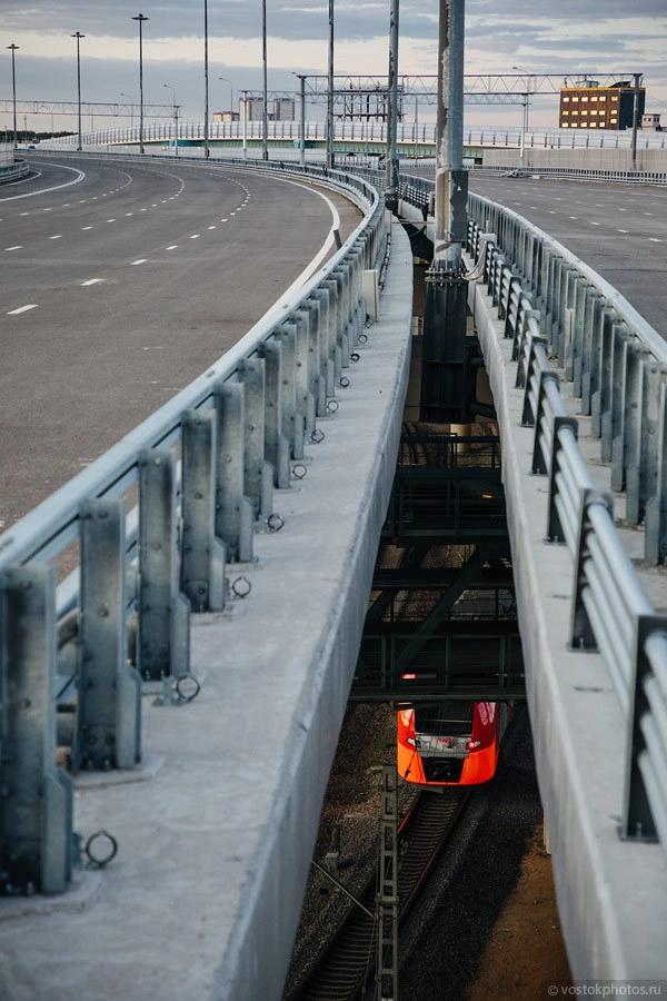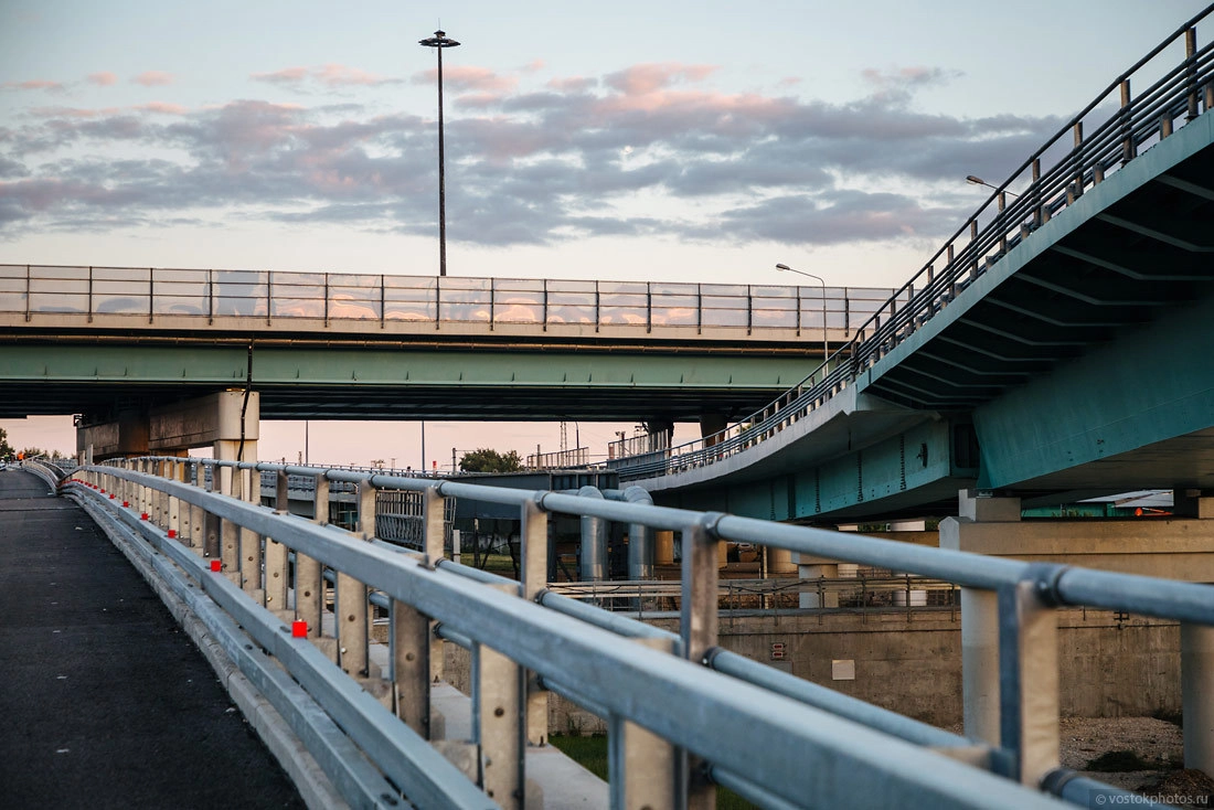 Компактный вариант трассы выглядит так: движение с севера будет организовано по эстакаде, которая пока еще не открыта, а движение с юга будет проходить под эстакадой. Тем самым трасса займет почти в два раза меньше площади.