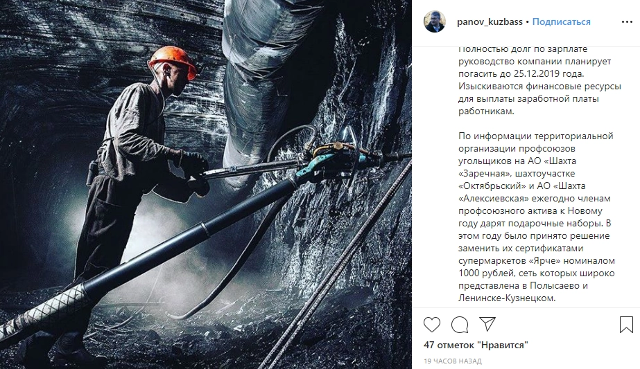17 декабря издание сообщило, что на шахте «Заречная» и на шахтоучастке «Октябрьский» работникам выдали продуктовые карты, которые можно реализовать в магазинах сети «Ярче!».