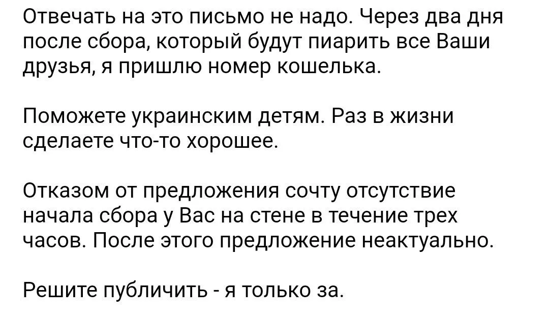 «Через два дня после сбора, который будут пиарить все ваши друзья, я пришлю номер криптокошелька. Поможете украинским детям», — указал Анатолий Шарий в письме.