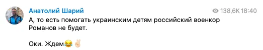 Владимир Романов собирать деньги для «пострадавших детей» отказался, о чем Шарий написал в своем Telegram-канале. Этим украинский блогер косвенно подтвердил, что именно он является автором письма с угрозами.
