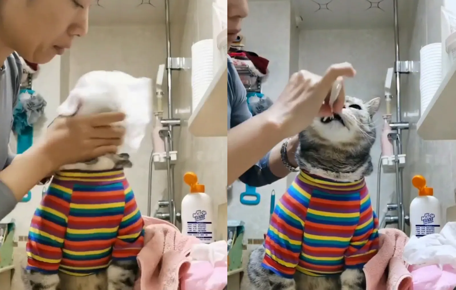 Но этот котик со своей хозяйкой вывели кошачьи умывания на совершенно новый, человеческий, уровень — с полотенцем, зубной пастой и щёткой. И самое удивительное, что шерстяной даже не думает сопротивляться.