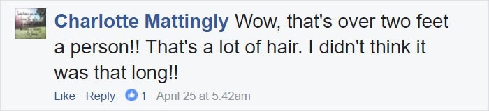 «В один прекрасный день мы с сыновьями отправились в местную парикмахерскую, где им обрезали волосы и отказались брать за работу деньги. Получилось 17 футов волос — это больше 5 метров! Выращенные с таким трудом и любовью волосы мы сразу отправили в организацию, которая занимается изготовлением париков для детей, лишившихся волос из-за болезни», — рассказала Фиби.