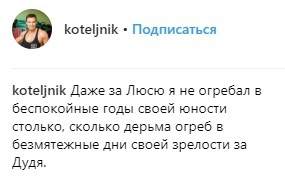 Даже за Люсю [монолог „Алло, Люся“] я не огребал в беспокойные годы своей юности столько, сколько дерьма огреб в безмятежные дни своей зрелости за Дудя, — написал артист на своей странице в Instagram.
