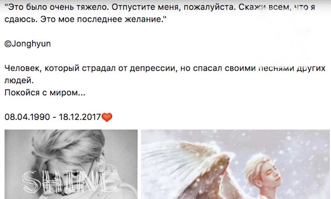 О том, что Джонхён собирается совершить суицид, сообщила сестра исполнителя. За полтора часа до трагедии она позвонила спасателям, но те не успели помочь молодому человеку, ранее сообщал «Ридус».