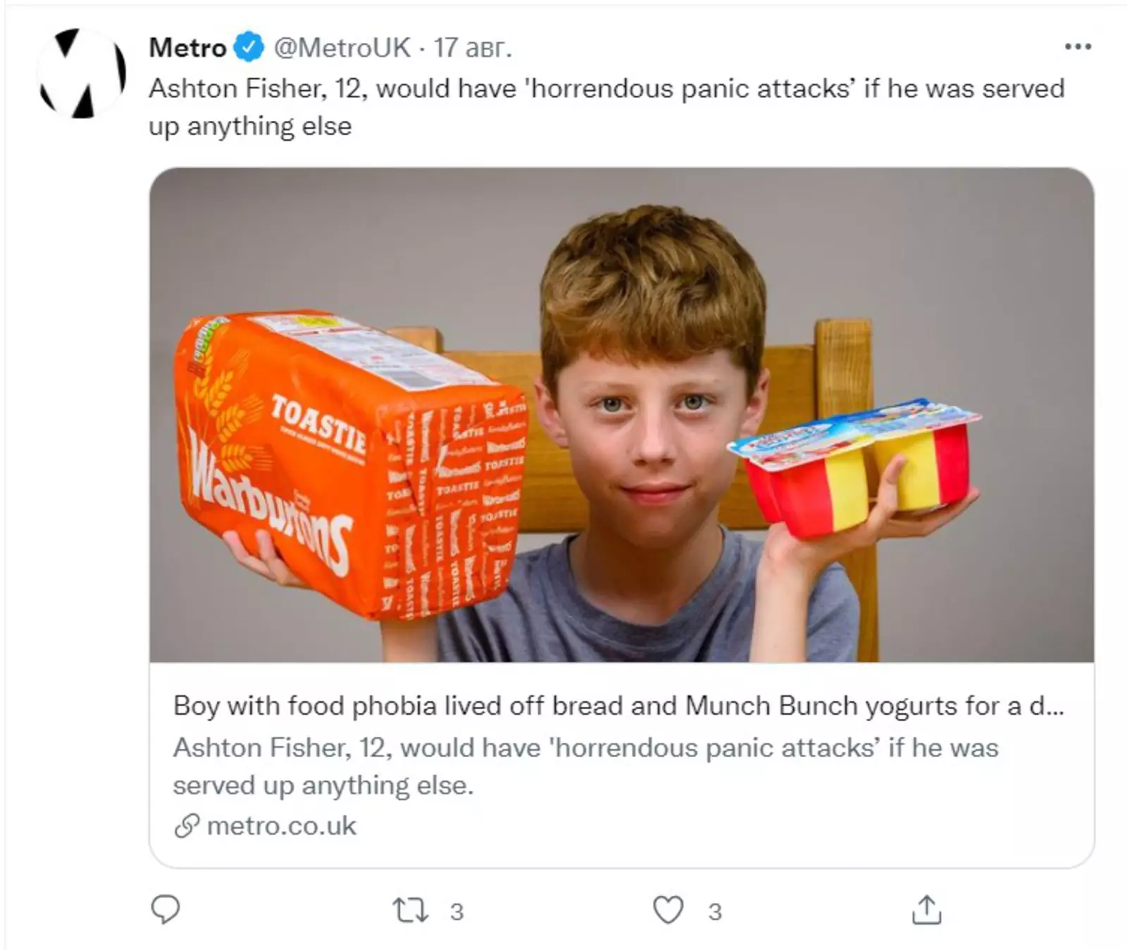 Например, 12-летний Эштон Фишер из Великобритании более десяти лет ест только белый хлеб определенной марки и фруктовые йогурты Munch Bunch со вкусом клубники и банана. Все потому, что у ребенка боязнь еды. Любая еда, кроме вышеуказанной, вызывает у Эштона приступы неконтролируемой паники.