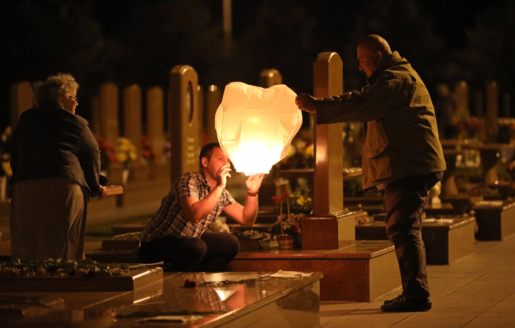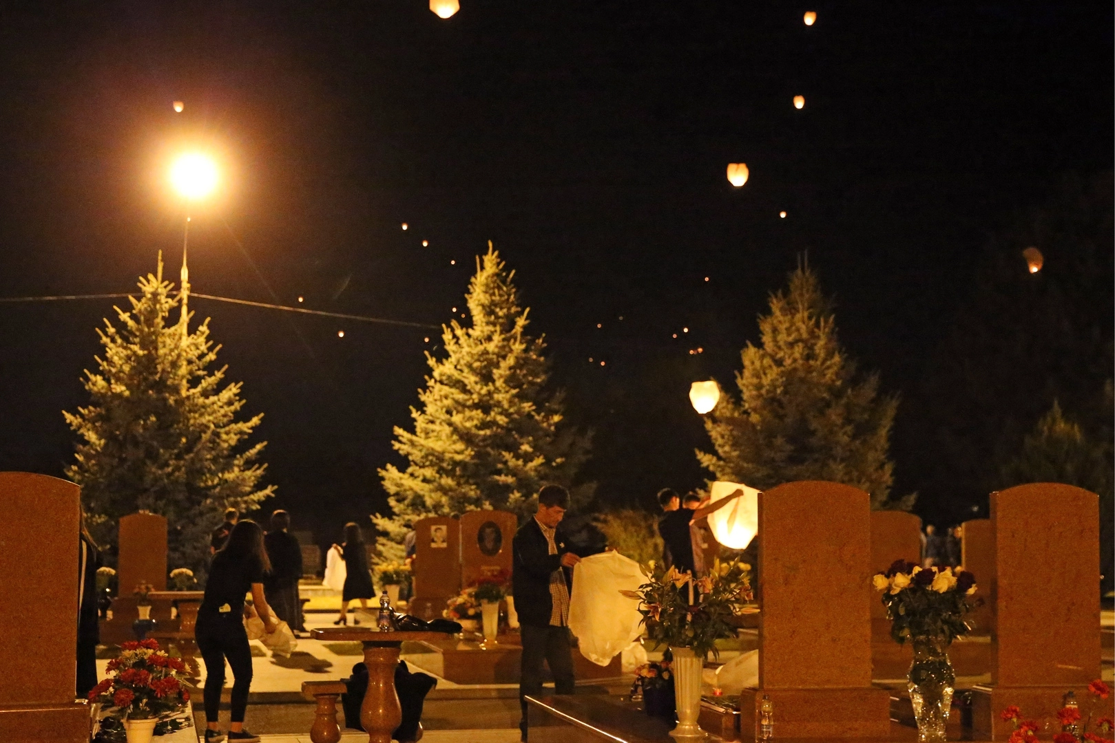 Участники памятной акции по запуску светящихся фонариков, посвященной жертвам террористического акта в Беслане, в мемориальном комплексе «Город ангелов».