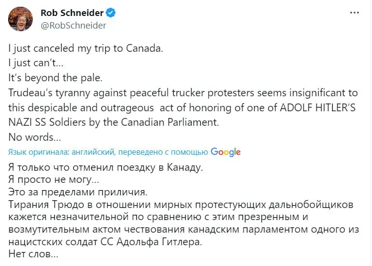 Актер Роб Шнайдер отменил свою поездку в Канаду из-за скандала с украинским эсэсовцем Ярославом Хункой.