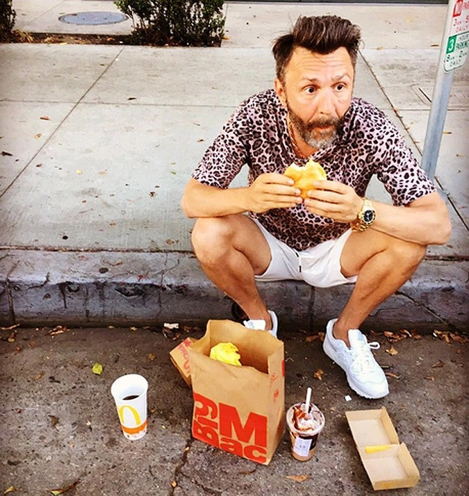По словам Шнура, для супруги ничего не жалко и он готов «бедствовать и тусоваться по „Макдональсам“». В подтверждение он тут же выложил фото себя, поедающего бургер, сидя прямо на тротуаре.