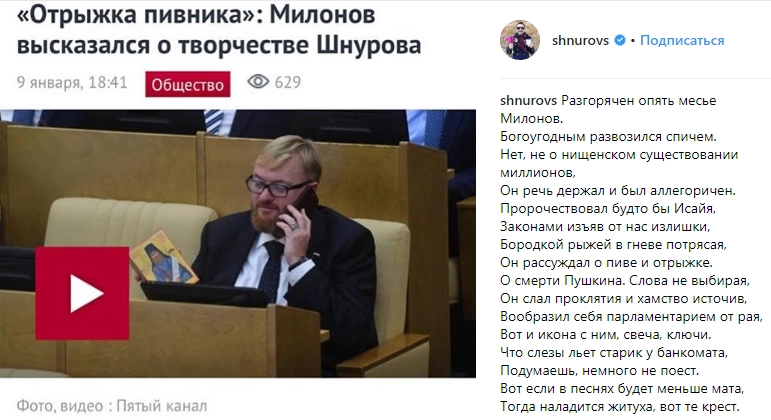 «Разгорячен опять месье Милонов. / Богоугодным развозился спичем», — так начинается новый опус Шнурова.