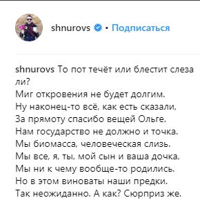 «Мы биомасса, человеческая слизь. / Мы все, я, ты, мой сын и ваша дочка, / Мы ни к чему вообще-то родились. / Но в этом виноваты наши предки», — написал Шнур.