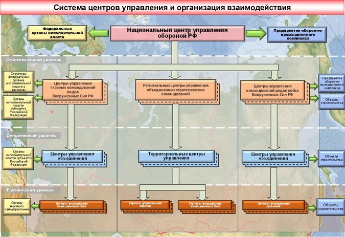 На всех уровнях управления создана развёрнутая система центров и пунктов управления войск (сил), работающих по единому регламенту взаимодействия. Их иерархия представлена на схемах. Она включает региональные и территориальные центры управления обороной, центры управления видов, родов войск и объединений Вооружённых Сил, пункты управления соединений.