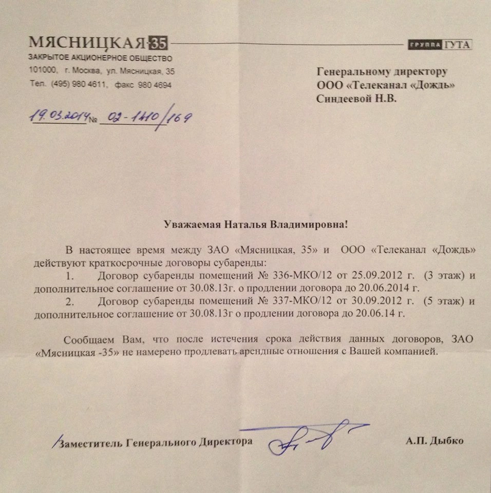 О скором прекращении «шоколадной аренды» «Дождя» поведал в Фейсбуке Александр Винокуров, супруг генерального директора канала Натальи Синдеевой. В доказательство своих слов он представил скрин полученного письма.