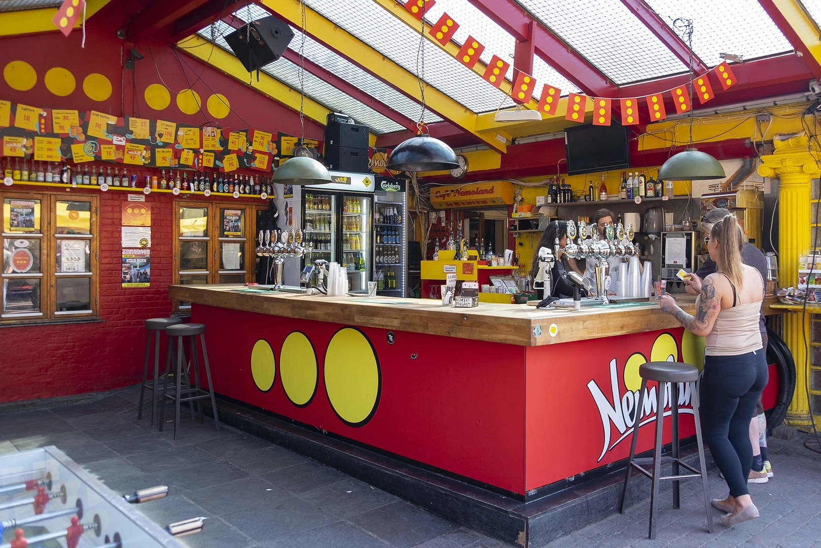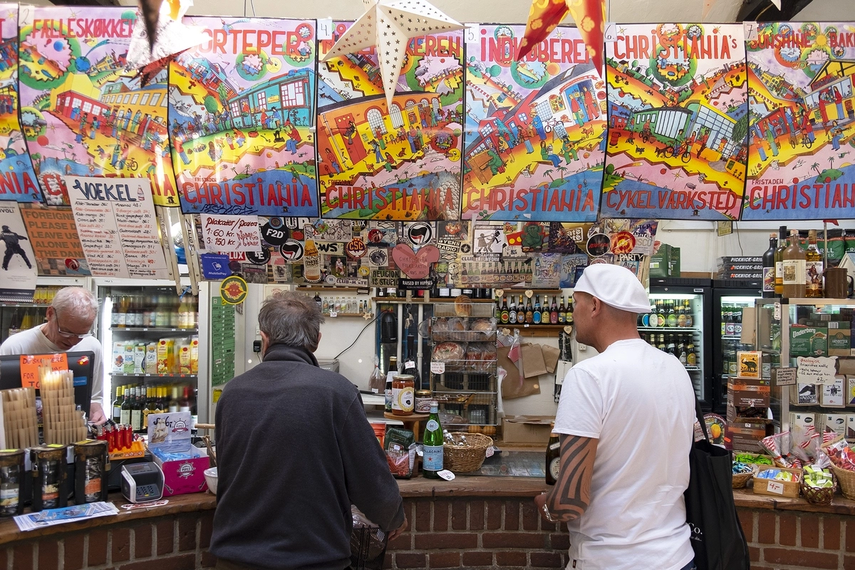 Тут есть несколько заведений фастфуда (шаурма, бургеры, салаты) и бары. Флаг Христиании — три желтых круга на красном фоне.