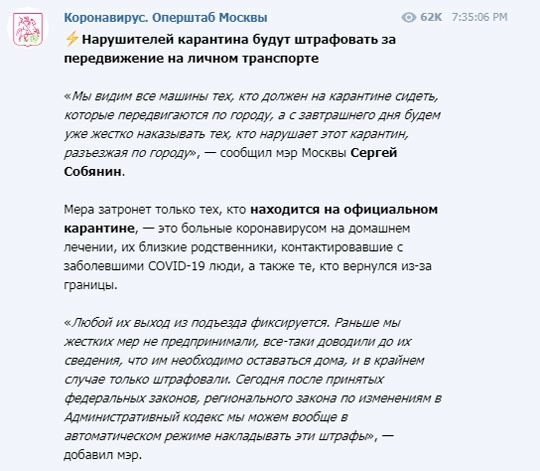 «Мы видим все машины тех, кто должен на карантине сидеть, которые передвигаются по городу, а с завтрашнего дня будем уже жестко наказывать тех, кто нарушает этот карантин, разъезжая по городу», — цитирует слова градоначальника оперативный штаб Москвы по контролю и мониторингу ситуации с коронавирусом.