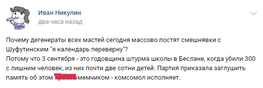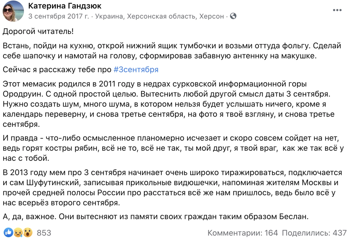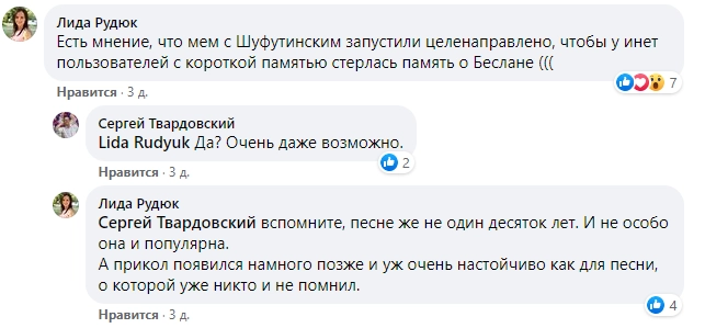 В Facebook, «ВКонтакте» и других соцсетях стали появляться сообщения о том, что ажиотаж вокруг «Третьего сентября» и посвященные песне мемы — якобы часть спецоперации Кремля, цель которой — стереть память о погибших в захваченной боевиками школе. Некоторые из них были опубликованы украинскими пользователями.