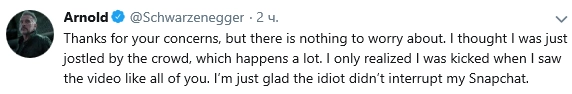 Спасибо, но беспокоиться не о чем. Я думал, что меня толкает толпа, что часто случается. Я понял, что меня ударили, только когда посмотрел видео, как и все вы. Я рад, что это идиот не прервал мою трансляцию в снепчате, — написал Шварценеггер в своем микроблоге в Twitter.