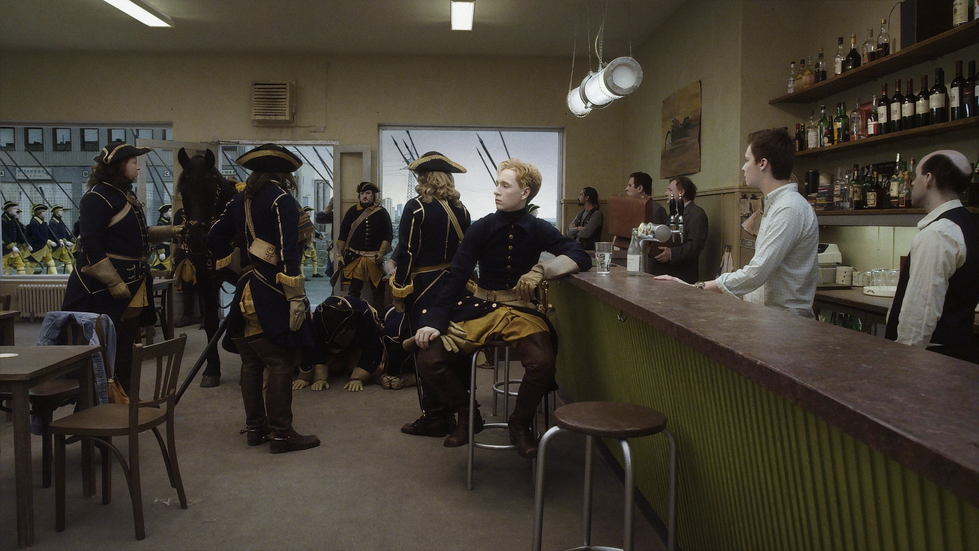 Здесь следует для ясности пересказать две сцены из фильма (не касаясь ничего иного, так как у нас ещё будет возможность к разговору об этом «Голубе» вернуться). Первая из них — неожиданная: притом, что действие картины разворачивается в современности, в самое обычное кафе вдруг врываются военные в мундирах явно старого образца. Но для ряженных ради какой-нибудь исторической реконструкции они как-то уж чересчур агрессивны: всадник выгоняет из заведения всех женщин, офицер кнутом избивает хромого калеку. Когда место очищено, появляется Карл XII — и можно только гадать, поддельный или настоящий. Отправляясь на войну с русскими, король выпивает пару глотков минералки и клеит бармена, предлагая ему место в своей походной палатке.
