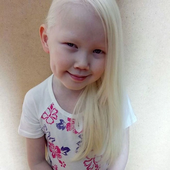 Удивительно, что все родственники юного создания обладают типичной якутской внешностью — тёмные волосы, брови, ресницы, карие глаза. А вот маленькая Нарияна родилась альбиносом: белоснежные волосы, синие глаза, фарфоровая кожа, белые брови и ресницы.