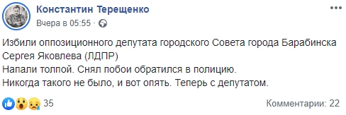 Депутат городского совета Барабинска Сергей Яковлев был избит группой подростков. Врачи обнаружили у Яковлева ушибы лица и пальца.