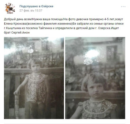 Сергей узнал, что, по слухам, его сестра живет в Озерске, тогда он разместил объявление в группе «Подслушано в Озерске» в соцсети «ВКонтакте» и попросил всех, кто узнает Лену, откликнуться.