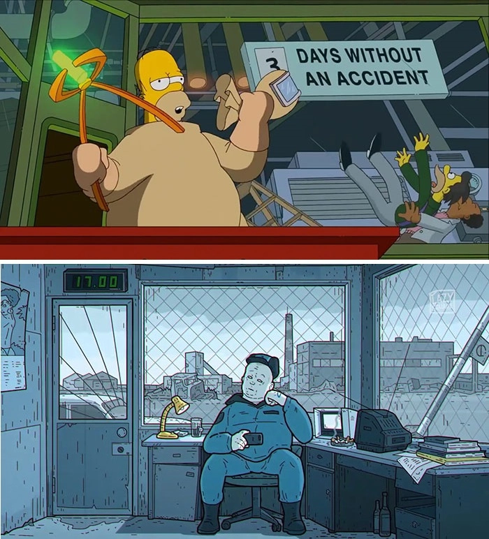 В русской версии, сделанной в мрачных серых тонах, действие происходит в провинциальном городке, наполненном обречённостью и безнадёгой, которой пропитан даже чёрный от фабричной копоти воздух. Гомер Симпсон, инспектор по безопасности Спрингфилдской атомной электростанции, становится охранником, который проводит весь день в телефоне и тащит с работы всё, что плохо лежит. Мардж — не заботливая мать, а скандальная, разочарованная в жизни женщина, ругающаяся в магазине. Барт Симпсон больше не озорной шутник, а жестокий хулиган-гопник, отбирающий ценные вещи у детей. Лиза — талантливая саксофонистка и активистка показана грустной маленькой девочкой, которая играет на одной из улиц, когда к ней подходят зловещие полицейские с дубинками. Как и в оригинальном мультфильме семья собирается вечером перед телевизором и там под звуки цыганской народной песни между ними разыгрывается безобразная ссора.