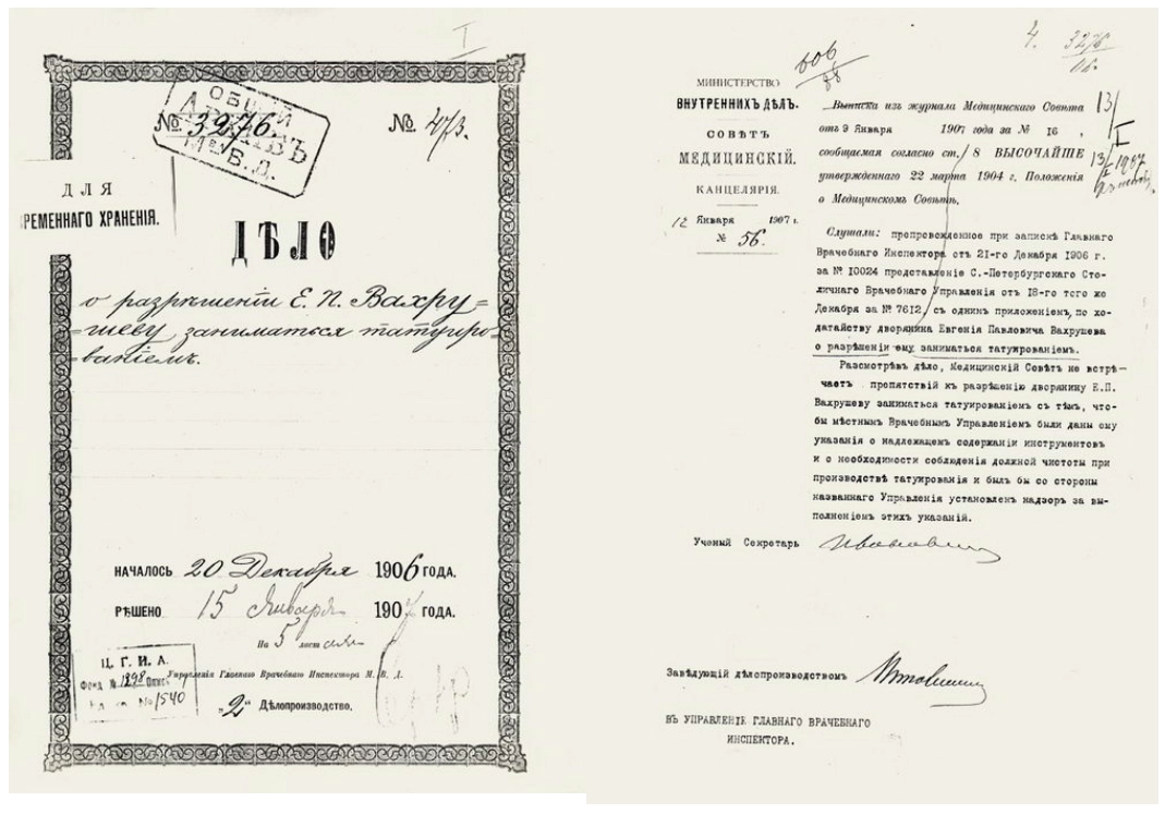 К концу столетия татуировка в России становится символом аристократии. 8 декабря 1906 года петербургский дворянин Евгений Павлович Вахрушев подал прошение начальнику главного врачебного управления с просьбой официально разрешить ему заниматься нанесением татуировок. После недолгой переписки он стал первым легальным татуировщиком в России.