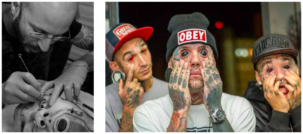 Первым человеком в России, сделавшим татуировку на глазном яблоке стал москвич Илья Бомбер. При нанесении подобной татуировки в глазное яблоко вводится игла и вливается краска, которая впоследствии растекается самостоятельно. Этот метод не безопасен, и всегда есть риск потерять зрение.