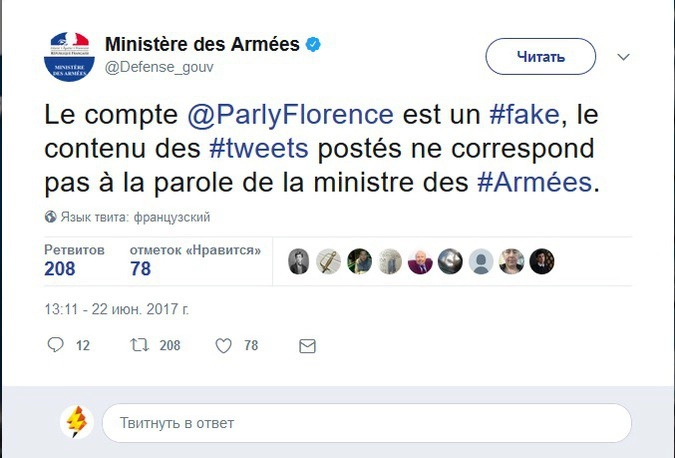 Фейковый твит мгновенно разошелся по СМИ, однако спустя несколько часов французское минобороны выступило с опровержением: аккаунт — не настоящий, а сообщение не соответствует действительности.