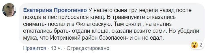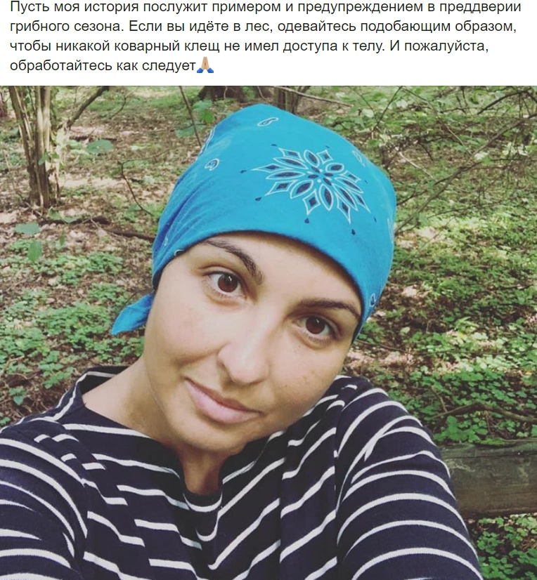 «В десятых числах августа пошла в лес с мужем, друзьями и их собакой. Лес знакомый, за поселок Абрамцево, Балашихинского района. Набрали грибов, довольные поехали домой. В машине с собаки муж снял 20 (!!!) штук клещей. Потом друзья дома сняли с неё ещё 10. Мы насторожились, решили друг друга осмотреть. На муже был один впившийся клещ, на мне два. У мужа появились первые симптомы на следующий же день, это есть в посте. Он обратился к дежурному врачу, тот сказал, что беспокоиться не о чем, это обычная аллергия. Поэтому и я не забила тревогу, когда на четвёртый-пятый день после укусов появились первые и характерные симптомы. В итоге, я ещё пять дней провела дома и попала в больницу на „скорой“ в тяжёлом состоянии. Провалялась там десять дней под капельницами и уколами, мне делали пункцию», — поделилась она.