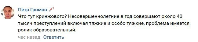Некоторые пользователи соцсетей посчитали ролик образовательным. Они напоминают, что несовершеннолетние совершают около 40 тысяч преступлений в год, в том числе тяжкие и особо тяжкие. «Проблема имеется».