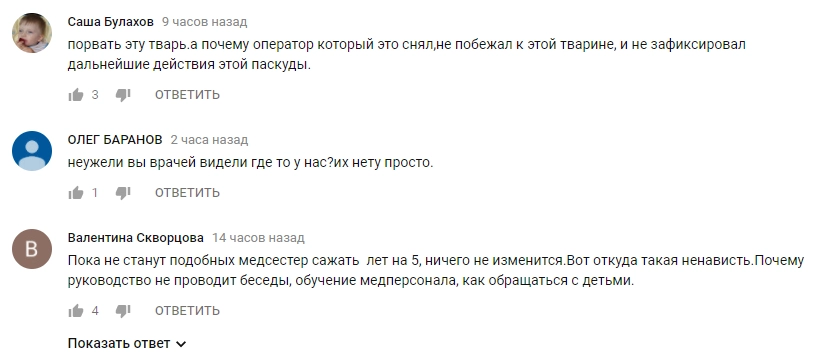 Женщина также слышала шлепки, из чего сделала вывод, что, вероятно, ребенка били. После того как она показала видео врачам, ей пригрозили уголовным наказанием за съемку ребенка, сказав, чтобы она не распространяла запись.