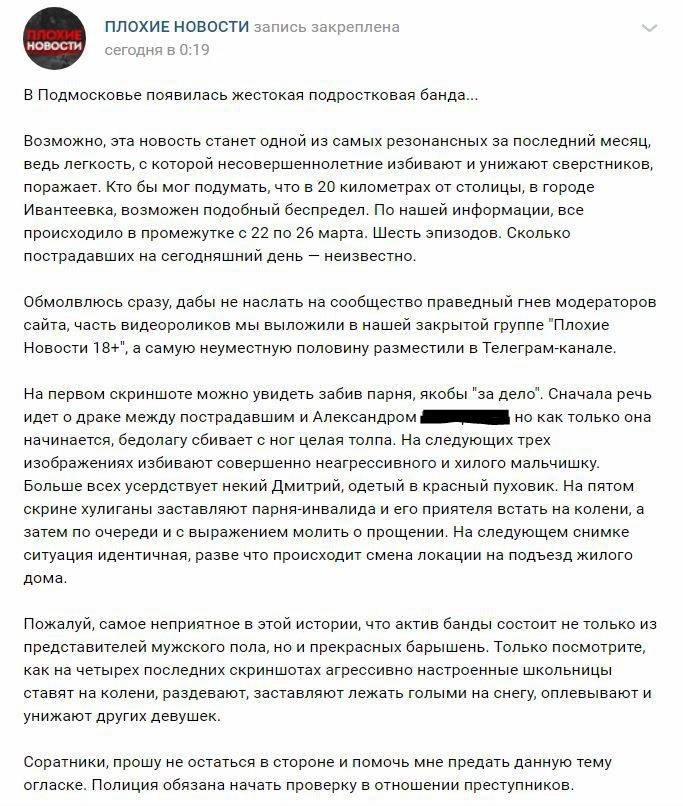 Под «информацией из соцсетей» имеются ввиду сообщения из паблика «Плохие новости», который работает сразу на нескольких площадках в Рунете. Его авторы в подтверждение выложили кадры видеозаписей, которые свидетельствуют о подростковой жестокости.