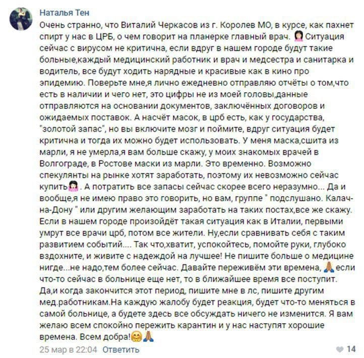 В понедельник, 27 марта, «Альянс врачей» опубликовал заявление молодого медработника из волгоградского города Калач-на-Дону Татьяны Реввы, работающей в местной ЦРБ. В заявлении было сказано, что в больнице нет средств индивидуальной защиты, а все врачи не готовы к приему больных коронавирусом.