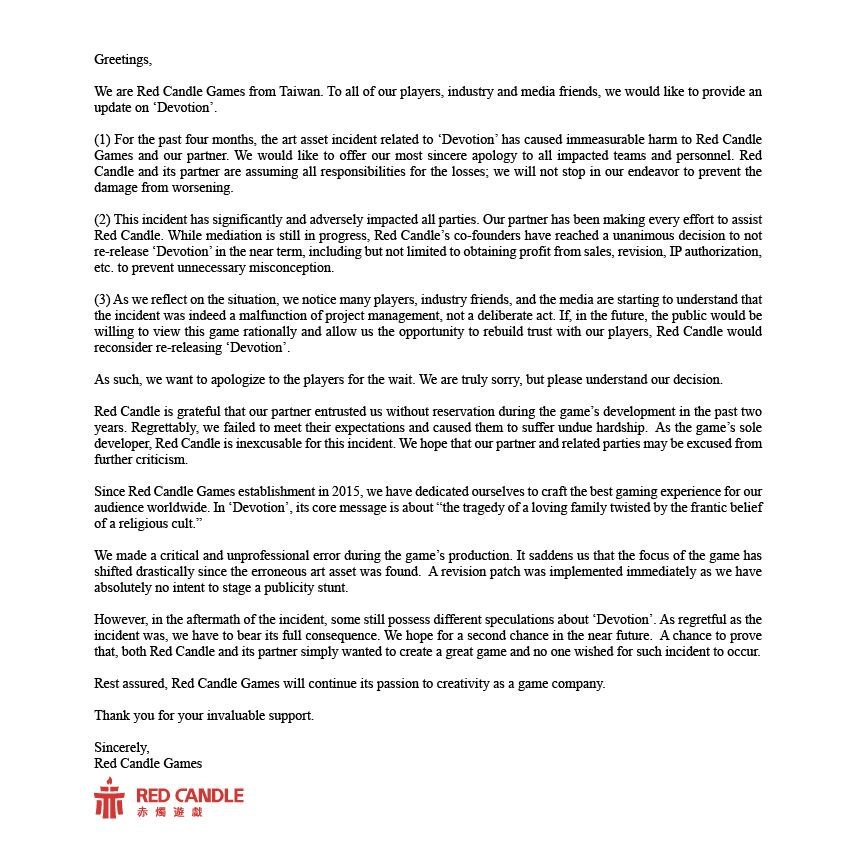 Соучредители Red Candle пришли к единодушному решению не переиздавать "Devotion" в ближайшем будущем, включая пересмотр лейбла, чтобы избежать ненужных заблуждений. Мы хотим извиниться перед игроками за ожидание. Мы действительно сожалеем, но, пожалуйста, поймите наше решение, — говорится в письме.