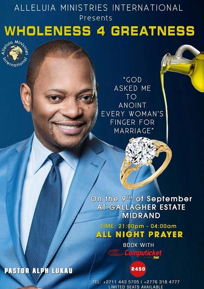 В 2016 году Альф Лукау попал в поле зрения СМИ после того, как организовал так называемый гала-ужин в конференц-центре Gallagher. На мероприятие были приглашены тысячи одиноких и разведенных женщин, которым было обещано, что молитва поможет им встретить родственные души и выйти замуж.