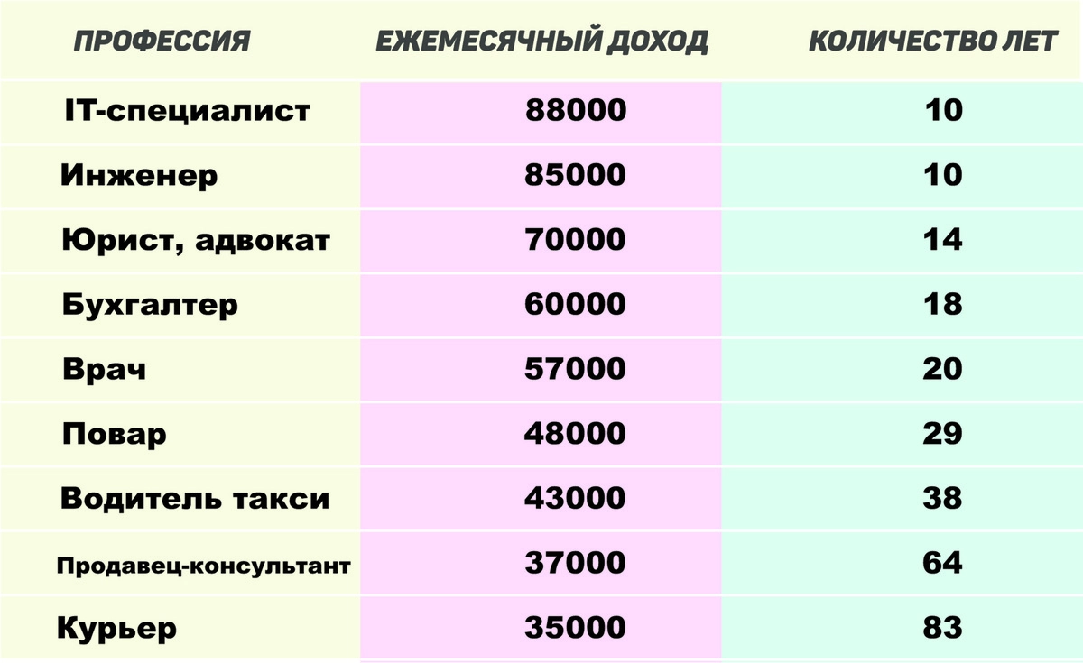 Рассчитать количество лет, которое потребуется представителям разных профессий, чтобы накопить на собственную квартиру, можно по формуле: стоимость квартиры / (ежемесячный доход — стоимость аренды комнаты — прожиточный минимум) x12) = количество лет.