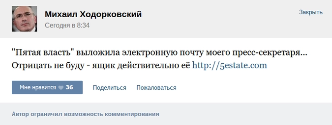 Напомним, подлинность переписки была подтверждена самим Ходорковским, впрочем, через несколько часов признание в соцсети было удалено: